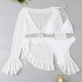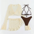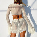 A complete beach outfit in one set: long-sleeve cover-up, bikini top, bikini bottom and matching skirt.